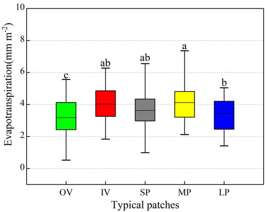 Variations of evapotranspiration among the five typical patches. OV, IV, SP, MP and LP mean original vegetation patch, isolate vegetation patch, small bare patch, medium bare patch and large bare patch, respectively. The middle bold line within the box represents the mean value, and the short lines at the end of the vertical line represent 5%~95% interval. Different letters indicate significant differences among the five typical patches (P < 0.05).