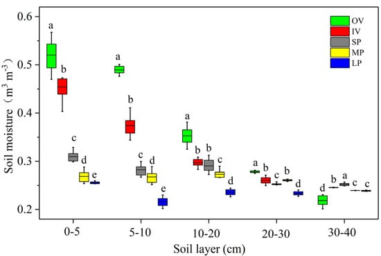 Variations of in situ measured surface soil moisture among the five typical patches. SP, MP, LP, OV and IV mean small bare patch, medium bare patch, large bare patch, original vegetation patch and isolate vegetation patch, respectively. Values fall between 5~95%, different letters indicate significant differences among the five typical patches (P < 0.01).