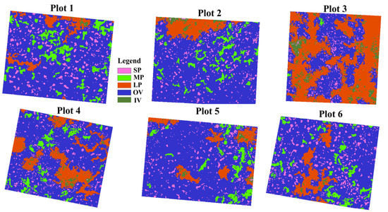Patchiness was presented as two distinct spatial patterns in our sampling plots (Figure 6). One was the mosaic of densely bare patches interspersed within a large intact vegetation patch, and the other was the mosaic of several isolated vegetation patches interspersed in the bare soil background (plot 3 in Figure 6). The classification images of the five typical patches showed that, with the exception of plot 3, OV had the largest patch area, the most complex geometric shape and the highest connectivity (Figure 7). Compared with OV, IV displayed as a more fragmented spatial pattern with smaller patch area, simpler patch shape, poorer continuity and higher patch density. SP had the smallest patch size and the highest patch density and only occupied 5% of the total landscape area. MP and LP had the analogous distribution with IV and OV respectively, but LP had smaller landscape indices.