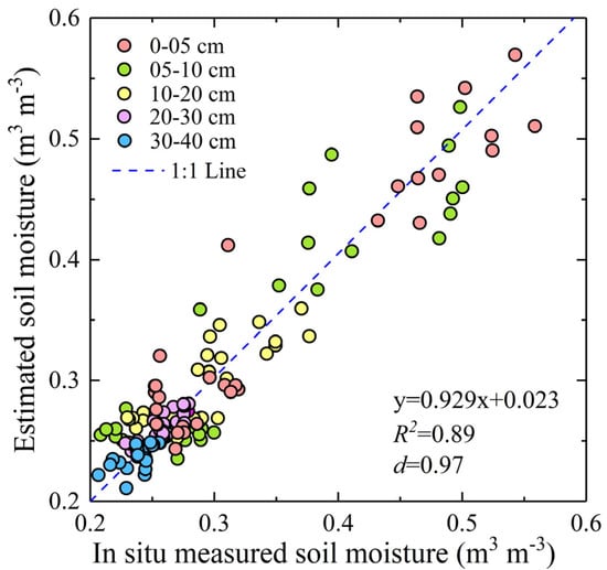 Validation of the estimated soil moisture with in situ measured soil moisture at different soil layers. d is the Willmott agreement index.