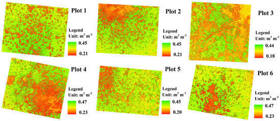 Considering that the effects of patchiness on SSM were concentrated in the 0–30 cm soil layer (Figure 5), and the UAV-based SSM estimated model also had considerable inversion accuracy in this soil layer, SSM estimated by the UAV in the 0–30 cm soil layer was, therefore, used for plot scale analysis. The spatial distribution of SSM was consistent with the spatial pattern of patchiness (Figure 7 and Figure 9). SSM in the vegetation patches was significantly higher than that in the bare patches. The existence of OV was conducive to maintain high SSM while the spatial distribution of LP led to significant reduction of SSM (Figure 7 and Figure 9).