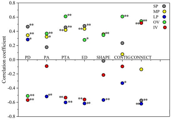 The correlation coefficient scatter plots between surface soil moisture (0–30 cm) and landscape indices of the five typical patches. SP, MP, LP, OV and IV mean small bare patch, medium bare patch, large bare patch, original vegetation patch and isolated vegetation patch, respectively. PD: patch density; PA: average area of patches (log-transformed); PTA: percent of total area; ED: edge density; SHAPE: shape index; CONTIG: contiguity index; CONNECT: connect index. (** indicates P < 0.01, * indicates P < 0.05, no marks indicate the correlation is not significant).