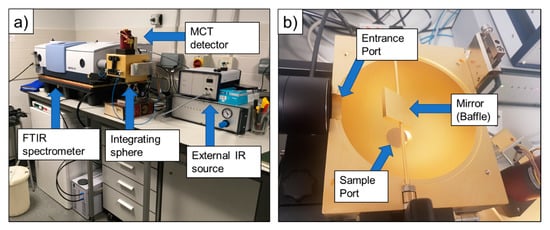 where is an open port measurement as detailed in Hecker et al. [58] and is the absolute reflectance of the internal gold wall of the integrating sphere ( across 2.5–14 μm) used as the reference target. An internal rotating mirror was used to move the infrared beam illumination between the sample and the reference position. Sample spectral emissivity was then calculated from reflectance using Kirchhoff’s law [59]: