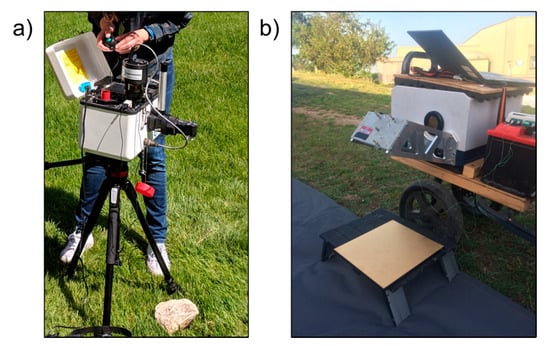 Two portable FTIR spectrometers were deployed in this study (Table 2). The first was the aforementioned D&P μFTIR spectrometer [31,32,40], specifically designed for surface emissivity measurement in the field (Figure 2). The instrument operates in passive emission mode to measure emitted LWIR radiation, and uses the two-temperature blackbody approach for its calibration. It has a 45° mirror (rotating to allow angled measurements) within an enclosed tube. The main improvement on the μFTIR design described originally in Korb et al. [31] and Hook and Kahle [40] is the inclusion of a Stirling cycle cooling for the detector in place of liquid nitrogen. The second FTIR deployed was a Bruker EM27, also with a Stirling cycle cooled detector and an internal blackbody target that can be rapidly heated and cooled to provide the necessary two point calibration [30]. Though this system is designed primarily for atmospheric remote sensing, it is easily adapted to assess surface emitted LWIR radiation via attachment of a 45° flat high IR reflectance gold mirror as shown in Figure 2. This mirror can then be used to reflect the surface target emitted and gold-panel reflected LWIR radiation into the spectrometer. The system, its 12 V battery/inverter and a controlling laptop were mounted on a rugged trolley for relatively easy transport around a field site. Spectral resolutions used were the maximum for the two systems, namely 0.5 cm−1 for the EM27 and 4 cm−1 for the D&P μFTIR, with spectral sampling intervals in practice of 0.25 cm−1 and 3 cm−1. The D&P was available for the measurements in Italy only.