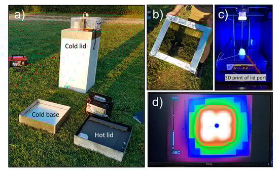 (a) Insulated emissivity box with the cold base and battery-powered hot lid. Details include (b) internal walls of highly polished aluminium, (c) a 3D printed 5° radiometer port for consistent off-centre angled sampling to avoid the “Narcissus” effect, and (d) evenly distributed electronic heating pads on the hot lid enabling heating up to at least 60 °C when combined with the heating tray.