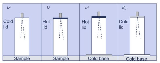 Radiance measurement sequence for the two-lid variant of the emissivity box method, using nomenclature from Rubio et al. [33]. Measurements proceed from left () to right ().