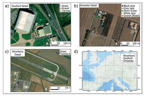 Field measurements for the study were made in three locations: a disused airfield at Alconbury (UK), a farm in Grosseto (Italy), and Duxford Aerodrome (UK; Figure 6). In total, fourteen different surface samples were considered, detailed in Table 4 and shown in Figure 7. These included manmade samples such as a large tarpaulin used as calibration targets in an accompanying airborne campaign, and natural samples such as homogeneous areas of grass, sand, and water.