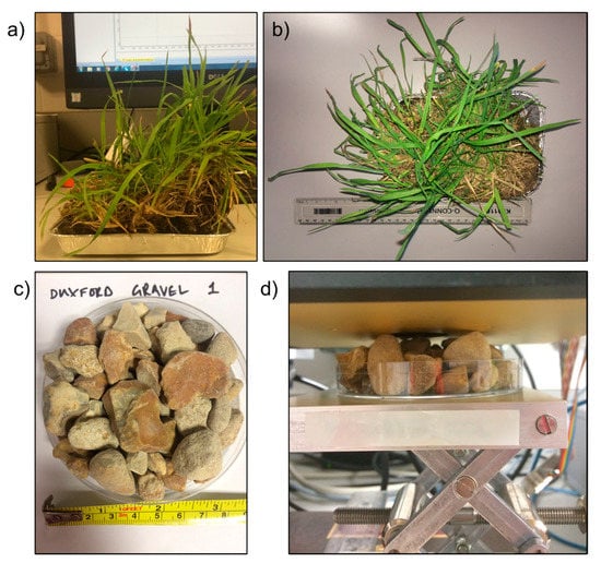 For the laboratory emissivity measurements, flat samples such as the tarps, card, and polystyrene were placed under the sample port of the integrating sphere shown in Figure 1a, with no gap between port and sample. To preserve the structure and moisture content of the Alconbury grass sample, a section of turf was extracted (Figure 8a–b) and measured the following morning in a foil container of high reflectivity, with the grass pressed underneath the sample port while ensuring no blades went inside the integrating sphere. This method was chosen over the method detailed in Salisbury and D’Aria [48] as it better mimicked field conditions. Distilled water, construction sand, and gravel were all placed into petri dishes such as that in Figure 8c, and measured as close to the sphere port as possible without risk of contaminating the inside of the sphere. Due to the uneven shapes and surfaces of the gravel, some gaps were observed between the sample and sphere (distances < 10 mm) as shown in Figure 8d. However, as with the grass, it was determined as preferable to measure the sample unaltered rather than change the structural composition so as to best mimic field conditions.