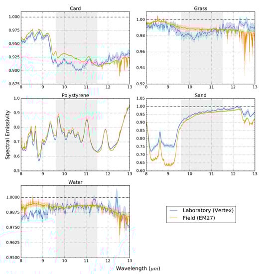 - Salvaggio, C.; Miller, C.J. Comparison of field- and laboratory-collected midwave and longwave infrared emissivity spectra/data reduction techniques. In Aerospace/Defense Sensing, Simulation, and Controls; Shen, S.S., Descour, M.R., Eds.; SPIE: London, UK, 2001; Volume 4381, pp. 549–558. [Google Scholar]