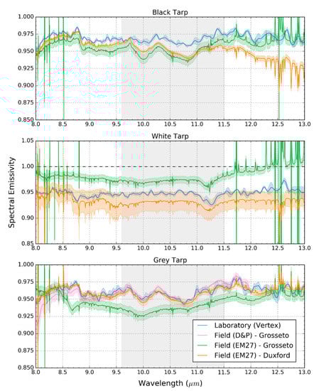 The surface spectral emissivities derived from measurements made by the two portable FTIR spectrometers (EM27 and D&P) along with those from the laboratory setup (Vertex 70) were compared to determine the absolute emissivity differences and the degree of agreement of the identified spectral features. The comparison was limited to the spectral range 8–13 μm, since this covers the wavelength range commonly employed in LST retrieval algorithms [62]. Measurements of the tarpaulins made using the EM27 in both Italy and the UK were compared to enable assessment of the performance of the same method in different environments.