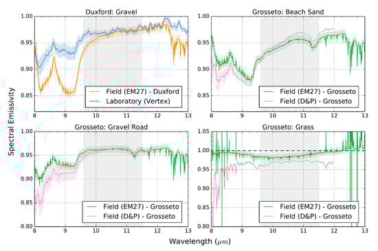 The sand, grass, and gravel samples from Grosseto shown in Figure 11 enable direct comparison of the data from the two portable FTIR spectrometers, with measurements collected almost simultaneously and under identical field conditions. The spectral emissivities of sand derived with the EM27 and the D&P instruments were within 1% of each other between 8.5 and 12.0 μm, and the gravel emissivities were within 2% of one another over the same range, with the increased differences for the gravel likely attributable to the increased variability within this material. There was also strong agreement seen between the spectral features for the beach sand and gravel road. These results promote confidence in the emissivity data derived from both FTIR instruments over the 8.5–12.0 μm range. While the measured emissivities of the grass from the two FTIR spectrometers were also within 2% of each, non-physical (>1) noisy emissivities are observed in the EM27 data of the grass sample in Grosseto, as was also observed in this instrument’s measurement of the Alconbury grass sample (Figure 9).
