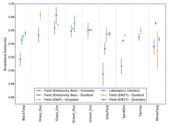 We conducted an inter-comparison of four different methods of LWIR surface emissivity retrieval, encompassing methods that derived full spectral emissivity data and broadband emissivities, and which operate in the field and in the laboratory. The methods considered are based on field measurements made with two portable FTIR spectrometers (a Bruker EM27 and a D&P μFTIR) operating in the emission mode, a laboratory FTIR spectrometer (Vertex 70) operating in directional hemispherical reflectance mode, and a two-lid emissivity box based on the design of Rubio et al. [33] also deployed in the field. Fourteen target samples were considered across four field sites covering both the UK and Italy, and these include man-made materials such as tarpaulins and natural materials such as sand, grass, and water.