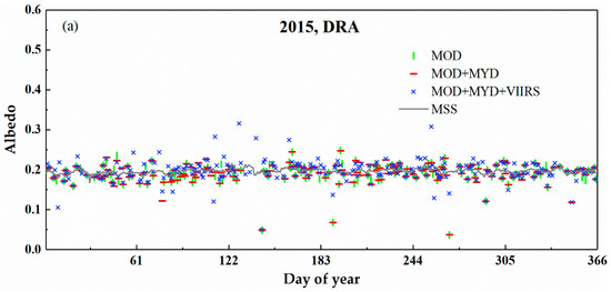 The validation results with SURFRAD and FLUXNET sites for the DEA and MSS approaches are shown in Table 5. The correlation coefficients and RMSEs of the DEA approach with MODIS, VIIRS, and the combination using MODIS and VIIRS data (MODIS + VIIRS) were similar. If we did not consider gap-filled data when no observation was available, the MSS approach provided better estimations with a higher R and a smaller RMSE (R = 0.9025, RMSE = 0.0351), which suggested that the MSS approach provided an improvement in estimation accuracy. If we considered the gap-filled MSS data, the results had a higher R and a larger RMSE (R = 0.9402, RMSE = 0.0385), which suggested that the gap-filled data introduced uncertainties to the estimation results. Because the MSS approach provided temporally continuous and gap-free albedo estimations, its relatively lower estimation accuracy was acceptable when no observation was available.