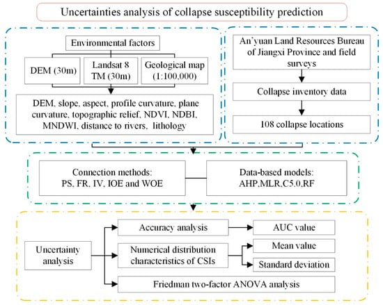 The CSP accuracy is significantly dependent on the quality of input variables; therefore, it is important to select the collection methods of collapses inventory and environmental factors to obtain the input variables. In addition, the coupled models between collection methods and data-based models can also create many uncertainties. By analyzing the performance rules and influence degrees of the above two kinds of uncertainty factors on the prediction of CSIs, the influences of these uncertainty factors can be better reduced. For example, the literature shows that some researchers have recently used WOE or FR for collapse susceptibility modeling without any proper explanations [,]. In this study, based on the five nonlinear connection methods of PSs, FR, IV, IOE and WOE, the AHP, MLR, C5.0 and RF models were selected to establish 20 kinds of different coupled models for the CSP. The specific research steps are as follows (Figure 3):