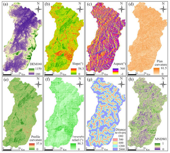 Topographical factors: (a) Digital Elevation Model (DEM), (b) Slope, (c) Aspect, (d) Plan curvature, (e) Profile curvature, (f) Topographic relief, (g) Distance to rivers and (h) modified normalized difference water index (MNDWI).