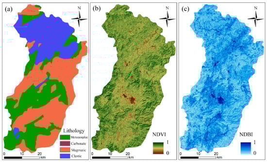 Land cover, hydrology and geological factors: (a) Lithology, (b) normalized differential vegetation index (NDVI) and (c) normalized difference built-up index (NDBI).