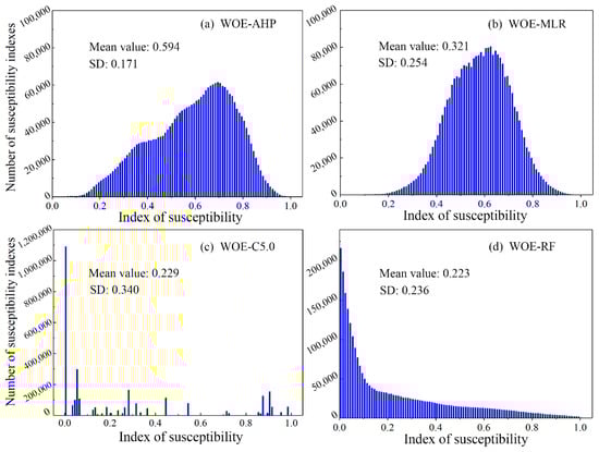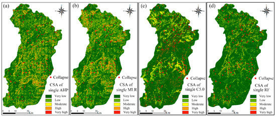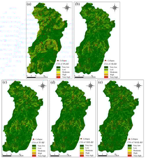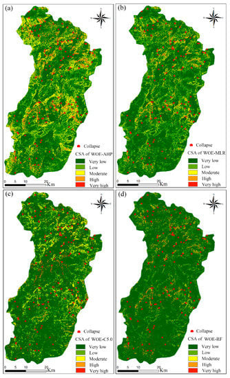 The whole study area was divided into 2,655,972 grid units under the grid resolution of 30 m × 30 m. All of the 11 environment factors were reassigned by the calculation results of the five collection methods, then these reassigned environment factors were used as input variables of CSP models. At the same time, a total of 108 recorded collapse polygons were divided into 1463 collapse grid units, which were assigned to 1, while the same number of randomly selected noncollapse grid units were assigned to 0. These collapse and noncollapse grid units were randomly divided into model training sets and testing sets by a proportion of 70%/30%. Finally, all the grid units with connection values in the study area were put into the four models, respectively, to calculate the CSIs, which were divided into five levels: very high (10%), high (20%), m rate (20%), low (20%) and very low (30%).
