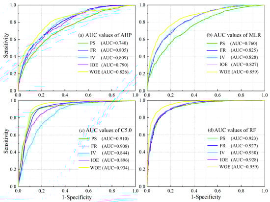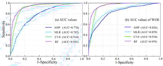 The ROC was used to evaluate the overall performance of the prediction model based on the quantitative indicators [,]. The ROC curve was calculated as follows: First, the values of CSIs were calculated, and various collapse samples in the testing dataset were sorted. Then, different truncation points were selected in this order. Next, whether each landslide sample was positive was determined. Finally, the “true positive rate” and “false positive rate” of the current classifier were calculated each time as the vertical and horizontal axis of the ROC curve []. To further quantify the classification performance of different models, the AUC (Area under ROC) was used as the specific evaluation index.