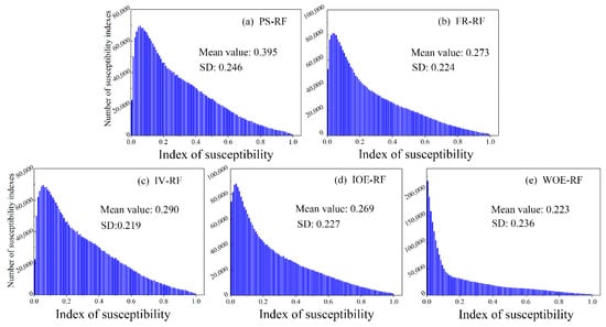 The nonlinear correlation analysis between collapses and basic environmental factors (no trigger factors) is considered as an important link between collapse susceptibility indexes (CSIs) and environment factors []. Then, these connection values will be directly used as the inputs of data-based models [,]. At present, many methods have been developed to construct correlation, mainly including weight of evidence (WOE) [], information value (IV) [], probability statistics (PSs) [], Index of Entropy (IOE) [] and frequency ratio (FR) [] methods. However, there is almost no specific evidence and/or literature evaluation to determine an appropriate connection method. The calculation processes and results of nonlinear connection methods will bring great uncertainties to the data-based models for CSP. In general, a rough or less than ideal connection method will lead to information loss and further reduce the model’s CSP performance; on the contrary, a reasonable and excellent connection method can contribute to obtaining the optimal input variables of data-based models and improve the reliability of CSP results. Therefore, it is of great significance to explore the influence degree of different connection methods on CSP modeling [].