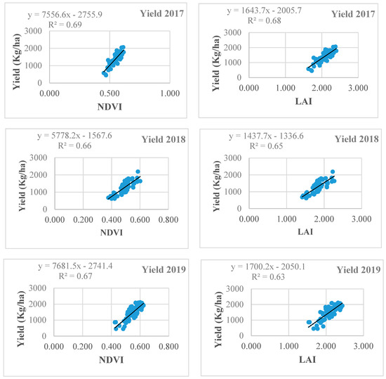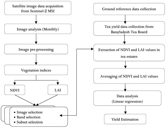 Yield data for three consecutive years (from 2017 to 2019) were collected from the Bangladesh Tea Board (BTB). The NDVI values were also extracted from Sentinel-2 satellite imagery for the years 2017 to 2019. The monthly average NDVI values were extracted for the active growing season (March to November) over the tea estates located in the study areas. The NDVI values were obtained according to the ground reference information collected during the field survey. The monthly average LAI values were derived from the NDVI values using geospatial techniques (Figure 3). The yield data were compared in a scatter plot through regression analysis using both the NDVI and the LAI.