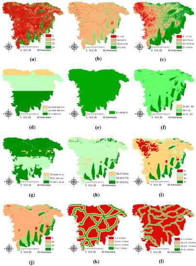 Reclassification of criteria: (a) LULC, (b) NDVI, (c) Elevation, (d) Precipitation, (e) Temperature, (f) Slope, (g) Soil texture, (h) Soil pH, (i) Drainage, (j) Soil type, (k) Distance from roads, and (l) Distance from rivers.