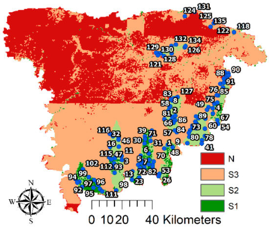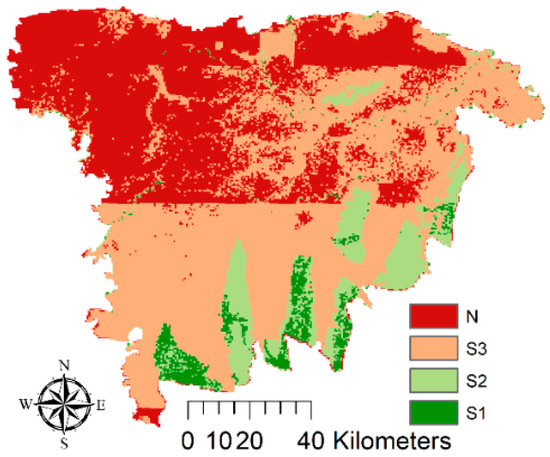 The land suitability evaluation for tea was conducted according to the classification guidelines proposed by the FAO. The guidelines for suitability classification were utilized to assess the suitability of each land unit for a particular use. According to the FAO’s guidelines for land evaluation, it was initially determined whether the land was suitable (S) or not suitable (N). The suitable class (S) was further divided as required. In practice, three categories—S1, S2, and S3—were used to evaluate the lands for tea cultivation. Thus, the land suitability evaluation was performed for the prioritized criteria that were reclassified into four categories. Eventually, the suitability classes for tea were determined using the weighted overlay based on the fraction weights obtained from expert opinions,