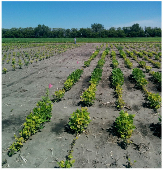 Among different methods available to combat IDC, such as planting a companion crop [3,4], applying iron chelate [5,6], increasing seeding rate, and planting in wider rows [7], planting tolerant cultivars was proposed as the most effective way to avoid IDC [8,9,10]. Although planting IDC tolerant cultivar reduces IDC incidence, it will not increase the yield throughout the entire field most of the time [11]. For IDC assessment, the commonly followed method is IDC visual score, but it is prone to human inconsistency and is a subjective measurement, which means that different experts may rate plots with different scores. A relatively poor correlation among experts () was observed when experts visually rated turf plots for leaf spot, density, and color [12]. Light conditions in the field also affect the appearance of color and the human perception of color, which in turn will influence the score [13]. The field rating will also be inconsistent because an expert may sometimes rate the same plot with different scores. In a study that was conducted on rating turf plots, raters’ variance of visual rating scores was found significantly higher than the variance of dark green color index (DGCI) from digital images after evaluating the same turf plots for several times [14].