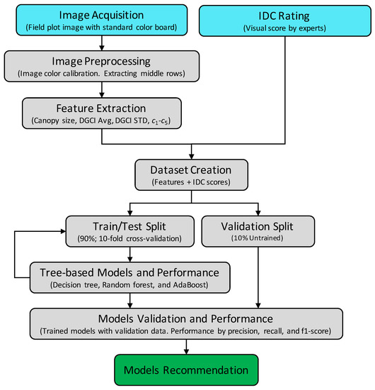 The CVI values from digital images for IDC rating are continuous, but the visual ratings values are discreet. Advanced machine learning classification algorithms are great models to predict discreet classes, similar to visual scores, based on continuous CVI values. These machine learning methods have been used in many aspects of agriculture, such as yield prediction [19], weed detection [20], iron deficiency rating [21], disease detection in wheat (Triticum aestivum L.) [22], and classifying broad agricultural land cover types [23], to mention a few.