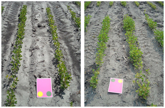 A sample image of soybean plot showing the two middle rows with the standard color board at two different growing stages: (Left) V2–V3; and (right) V5–V6).