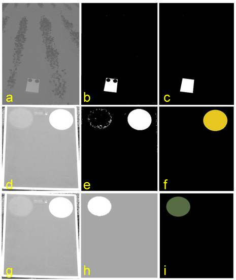 As colorspace separated the standard color board from the background and plant rows, HSB colorspace was suitable to recognize color disks of the color board. The DGCI values of yellow and green disks were required to calculate the slope and y-intercept (Equations (2) and (3)). Since the hue (H of HSB; a grayscale image, Figure 5d) for yellow and pink are significantly different, a value of was used as the threshold to remove non-yellow pixels from the cropped image (Figure 5d). However, the hue for green and yellow are close to each other, but the saturation (S of HSB) of the green disk was the lowest on the board. Therefore, using a range of S < 0.1 ensured that the biggest object in the cropped image is the yellow disk. The rest of the cropped board was converted to a binary image using imbinarize() command and Otsu threshold method (Figure 5e). Otsu method separates the foreground and background in a grayscale image by maximizing the inter-class variance. Finally, to remove the small particles from the cropped binary image and to preserve the shape of the disk, a circular structure was used within imerode() function using the area threshold from the previous step automatically extracted the yellow disk (Figure 5f).