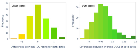 Based on visual scores, almost 30% of the plots became worse compared to Date 1, which is not the actual case (Figure 7). Human inconsistency can cause this difference [13,14], and it was shown that the IDC rating that was done in the “office” or “through computer” is more consistent than the field rating [25]. This can be seen from the difference frequency plot that DGCI had fewer negative values compared to visual rating scores.
