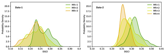 Distributions of the average DGCI values for different MR show that plots with lower MR are scattered around higher average DGCI values, but there was still a notable amount of overlap between adjacent classes (Figure 8). Field expert rater’s error in detecting the right class and having an average of DGCI for each plot representing IDC severity resulted in having these increased standard deviations in each class. Therefore, using different classes of DGCI to study the distribution of chlorosis in each plot could alleviate some of the problems for machine learning models in the future. It should also be noted that both methods performing average by some means will result in overlaps of various degrees leading to misclassification and cannot be eliminated.