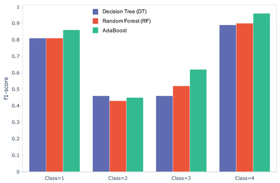 The AdaBoost model showed an improvement compared to both DT and RF models (Table 3 and Figure 9). The average f1-score compared to RF had 8% and 5% increase for Dates 1 and 2, respectively. The recall is of great importance in this study especially for Class 1 because it is the healthiest class and will help farmers to understand and manage IDC symptoms. AdaBoost increased the overall f1-score of Classes 1 and 3 for Date 1 compared to RF, but the performance was significantly higher compared to the DT model (16% and 21% increase for Classes 1 and 3, respectively). With regard to Date 2, AdaBoost showed a 7% increase in recall for Class 1 compared to both DT and RF models. The overall f1-score for AdaBoost was at least 5% higher than the other models (72%). However, AdaBoost also struggled with classifying the middle MRs (2 and 3), but it performed better than the DT and RF. For instance, f1-score on Date 1 for Class 2 is 65%, which is still lower than those of Class 1 and 3 (≈85%), but it is much greater than that of DT (31%) and RF (55%). Similar to RF, the performance of AdaBoost on Date 1 is significantly better than Date 2 because there were only three classes available on Date 1 and the RF had a lower chance of misclassification compared to four classes of Date 2.
