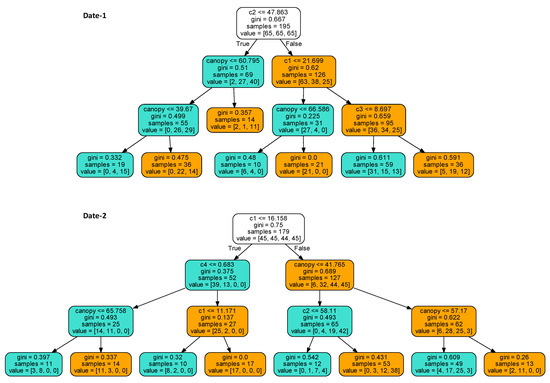 Among all the features that were used in decision-tree-based models, DCGI had the highest importance (Table 4). DT, unlike the ensemble models, only uses one tree for prediction, and shows the highest importance especially for Date 2, where the average canopy size and variation among canopy sizes were dominant. Canopy size is the second important feature as IDC causes stunt growth in soybean plots. Middle range DGCI is in third place, and it showed significant importance in all models, except DT for Date 1. The average value and variation of on Date 1 were much lower than previous classes and lower than on Date 2, so DT could not use this class effectively for prediction; however, the ensemble methods utilized this class more effectively.