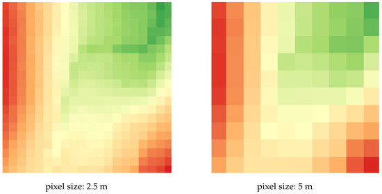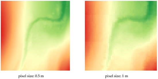 To determine the influence of the pixel size of the used DEMs on the accuracy of the obtained passability maps, analyses were conducted on different resolution DEMs. They were created from two sources of data: LIDAR and the UAV photogrammetry data in four different resolutions (0.5, 1, 2.5, and 5 m). Their visualizations are presented in Figure 3. The aim of the differentiation of pixel sizes was to calculate the processing time of the script, which allowed us to determine the dependence between the running time of the tool and the detail of the model. The increase in the DEM pixel size therefore allowed us to reduce the generation time of the passability map and, consequently, to develop it on a larger area in a shorter time.