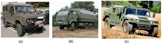 Analyzed vehicles: (a) Honker [54]; (b) Star 266 [55]; and (c) HMMWV (High Mobility Multipurpose Wheeled Vehicle; colloquially: Humvee) [56].