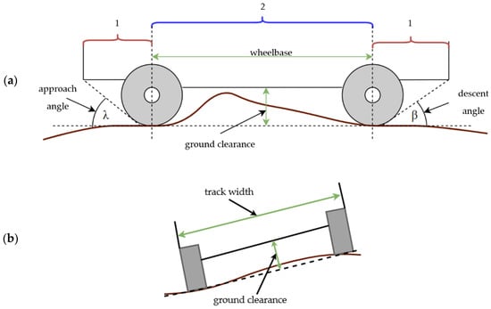 Visualized parameters of the vehicle: (a) side view (1—checked by the change of slope; 2—checked by the Python script); and (b) rear view.