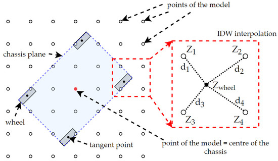 - In the next step, the z-coordinates of wheels are calculated. The script chooses four points of the grid that are closest to the wheel and then computes the height with the use of an inverse distance weighted (IDW) interpolation [58]. We can see this step in Figure 7.