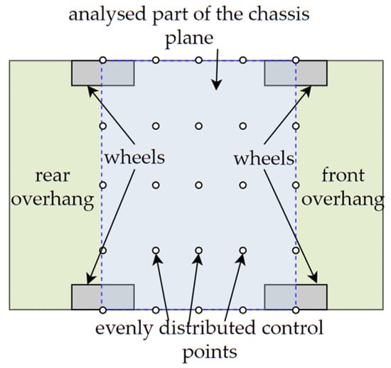 Figure 9. Evenly distributed control points in the analyzed part of the chassis plane (bird’s eye view). - Finally, the script checks each control point for whether its height exceeds the height of the terrain interpolated from the model. Unless all points meet this requirement (are higher than points on terrain), the analyzed point of the model is assigned the value 0 (impassable).
