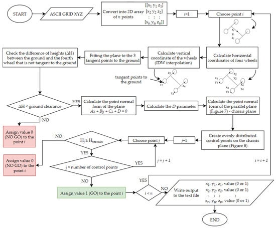 For the better visualization of the whole process, a block diagram was created. This shows the detailed process that the ASCII GRID XYZ file must undergo to obtain the file with points of the model and the indicator of the passability. The diagram is presented in Figure 10.