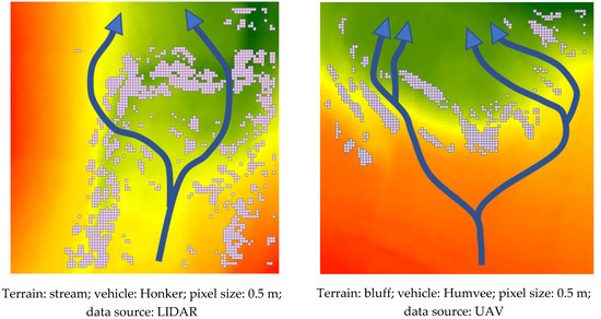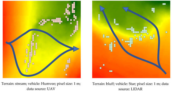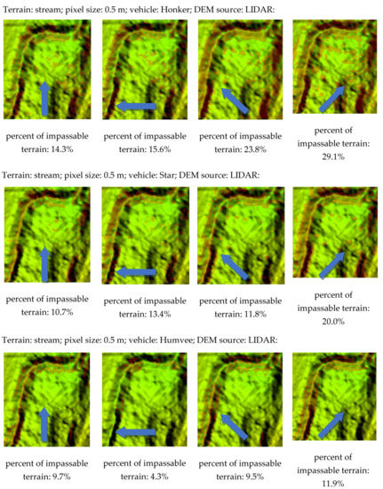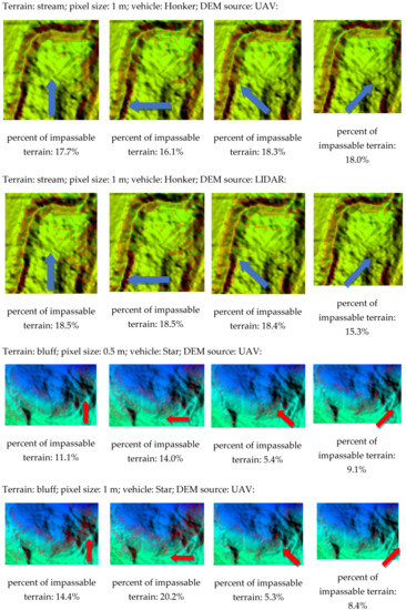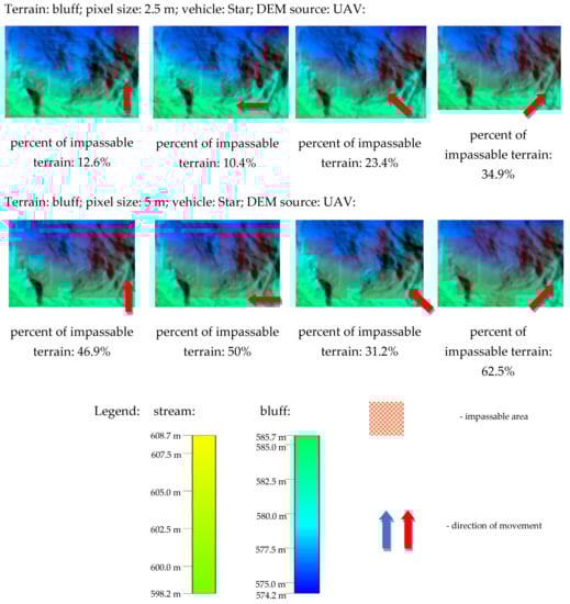 The products of the analysis show the impassable parts of the tested terrains in multiple configurations for each vehicle. The results are computed for each direction of movement (north, east, northeast, and northwest), for two kinds of data (from LIDAR and from UAV) and for each resolution of DEM (0.5, 1, 2.5, and 5 m). Due to the large number of results, some of them are only presented briefly (Figure 11). The arrow indicates the direction of the vehicle movement.