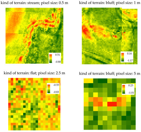 The change of the pixel size did not strongly influence the average height. There were no differences between the 0.5 and 1 m resolution models, and between the 1, 2.5, and 5 m, there was 20 cm maximally. As far as the standard deviation is concerned, its value depends on the kind of terrain, which the elevation model represents. The highest value was in the bluff terrain and the lowest was the flat terrain. In the second step of the comparison, visualizations of differences between models obtained using two sources of data were generated (the results are presented in Figure 12).