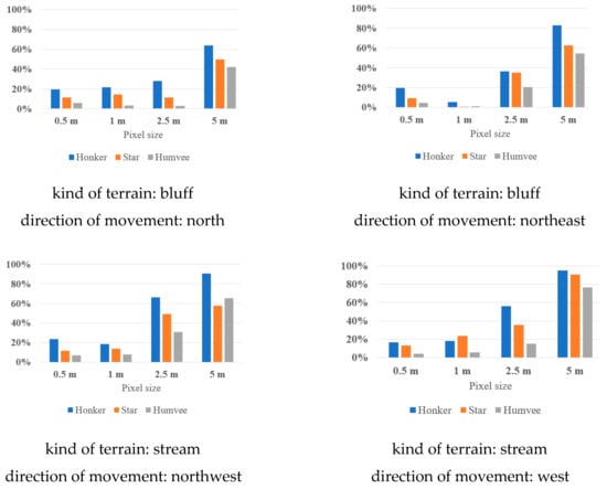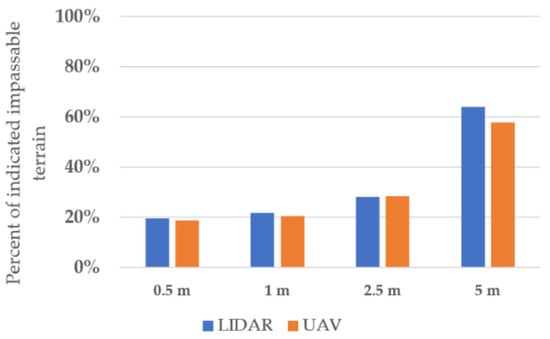 The results showed that, in most cases, when the analysis was based on the models of the same parameters but different data sources, the percentages of impassable terrain indicated by the script were similar. The biggest variances were in the 5 m pixel size models. This was mainly caused by the inaccuracy of the model in detecting the microrelief shapes and the large area that was covered by one pixel in this model (25 m2—1% of the whole analyzed terrain). Considering that LIDAR data can be easily obtained from the state geodetic and cartography and the creation of the model from the UAV is much more complex and time consuming, the more optimal solution is to create DEMs for the passability analysis from the LIDAR data. The chart showing dependences between the percent of indicated impassable terrain (Honker vehicle, bluff terrain, 0.5 m pixel size) from elevation models from different data sources is presented in Figure 20.