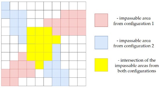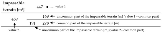 An important factor that influences the evaluation is also the intersection area, which shows the degree of consistency between the obtained outputs. In Table 6, Table 7, Table 8, Table 9, Table 10 and Table 11, we present the numerical values of intersection. We can conclude from these that the correspondence grew with the increase in the pixel size of the used models. In smaller resolutions, the proportions between the common and uncommon impassable areas fluctuated around 50%. Despite such unsatisfactory numerical values, the visualization of outcomes showed a high consistency between them. We can see in Figure 18 that, in most corresponding cases, there was a distinguishable main character of impassable area. The difference between outputs was mainly caused by the disparity of the used DEMs.