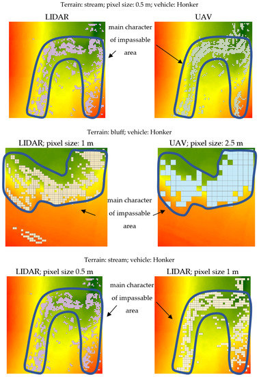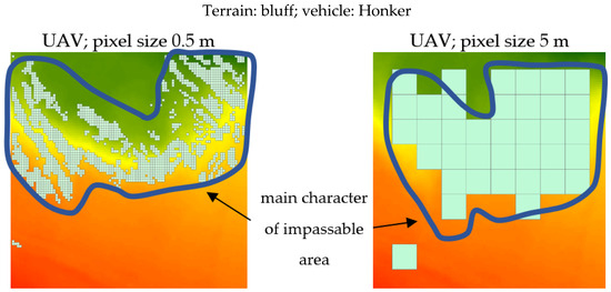 The conducted research demonstrated clearly that the presented methodology with the implemented authorial method of the parallel shift of the plane was able to detect microrelief objects and, consequently, impassable areas with different resolution digital elevation models. In the analysis, we used DEMs created on the basis of LIDAR and UAV photogrammetry data in different resolutions: 0.5, 1, 2.5, and 5 m as well as the parameters of three kinds of vehicles widely applicable in the Polish Armed Forces: Honker, Star, and Humvee. The differentiation of resolutions was made to answer the question: which model is the most efficient in obtaining the best results possible in the shortest time?