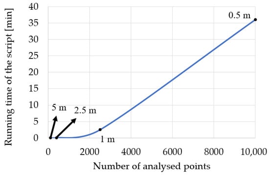 In Figure 21, we can see the dependence between the time of the execution of the script and the number of analyzed points. The chart was created based on Table 4. The number of analyzed points grew due to decrease in the pixel size of the elevation model. We can see from the presented chart that the increase in the points caused an exponential growth of the running time of the script. The analyzed terrain was relatively small (50 × 50 m). If the passability analysis concerned larger terrain, the whole process would last much longer. To choose the most optimal option, we must consider two main factors: the accuracy of the results and the time of obtaining them. The conclusions are described in the next section.