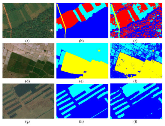 Segmentation results for satellite images from our dataset part 1 [23] (different clusters for each image are marked with selected colours): (a) satellite image “71619_sat,” (b) corrected GT image “71619_gt” with 4 clusters, (c) k-means++ segmentation results “71619_seg” of “71619_sat,” (d) satellite image “161109_sat,” (e) corrected GT image “161109_gt” with three clusters, (f) k-means++ segmentation results “161109_seg” of “161109_sat,” (g) satellite image “676758_sat,” (h) corrected GT image “676758_gt” with two clusters, (i) k-means++ segmentation results “676758_seg” of “676758_sat.”.