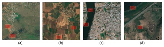 Sampled satellite images from the DeepGlobe Land Cover dataset with two selected 324 × 220 regions that are highlighted in red and are used for our dataset: (a) “676758_sat.jpg,“ (b) “762359_sat.jpg,“ (c) “941237_sat.jpg,“ (d) “668465_sat.jpg.“ Names of images from our constructed dataset [23] share the same <ID’s> in part1 and part2 folders.
