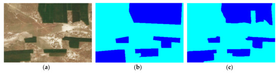 Example of visible structural inaccuracies in agriculture land (different image clusters are marked with selected colours): (a) satellite image “965977_sat_00000.png“ from our constructed dataset, (b) not corrected GT image of “965977_sat_00000.png,“ and (c) corrected GT image of “965977_sat_00000.png “ from our constructed dataset.