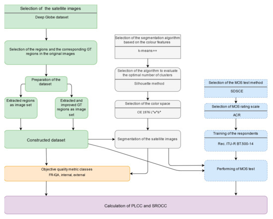 This article has the following structure. Section 2 provides a summary on published papers in the context of subjective and/or objective segmentation quality assessment of the satellite or natural images. Section 3 provides an overview of the k-means++ clustering method. Section 4 describes the characteristics of dataset and dataset preparation for the segmentation, objective, and subjective quality assessment. Internal, external, and full-reference image quality assessment (FR-IQA) metric groups considered in this experiment are explained in Section 5. Section 6 provides information on the subjective quality assessment procedure. Experimental results, including the roadmap of technology and used correlation coefficients, are presented in Section 7. Discussion and directions for future research are presented in Section 8. Finally, conclusions in Section 9 summarize the main observations from the discussion.
